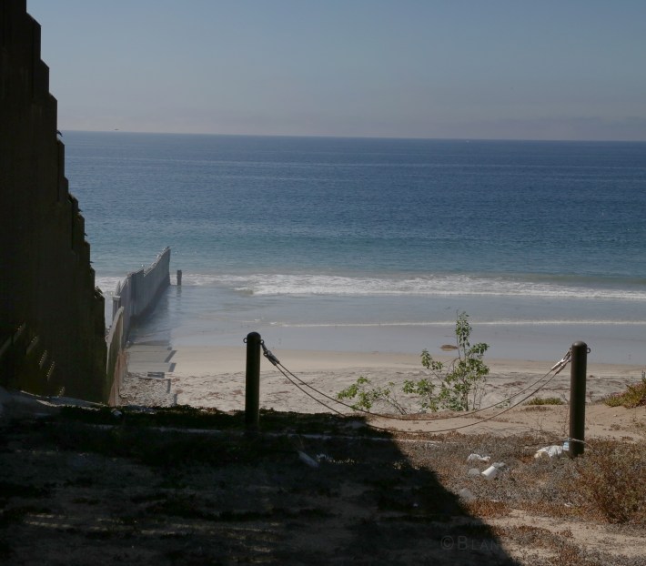 Older Mexico-US border wall view into Pacific Ocean, California side.