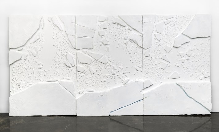 The artist relief paintings show various forms of Arctic ice, such as multi-year ice, which stays frozen for consecutive seasons. The triptych also shows the vastness of the ice sheets, carving sections of white ice drifting apart and making the water underneath seem exposed.