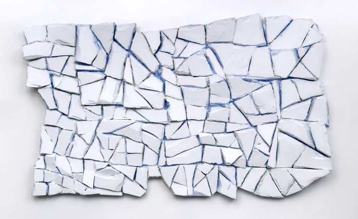 De St. Croix’s relief paintings the surface seems ice like cracking in chunks across the surface, the surface or facade of glaciers breaking and fracturing.