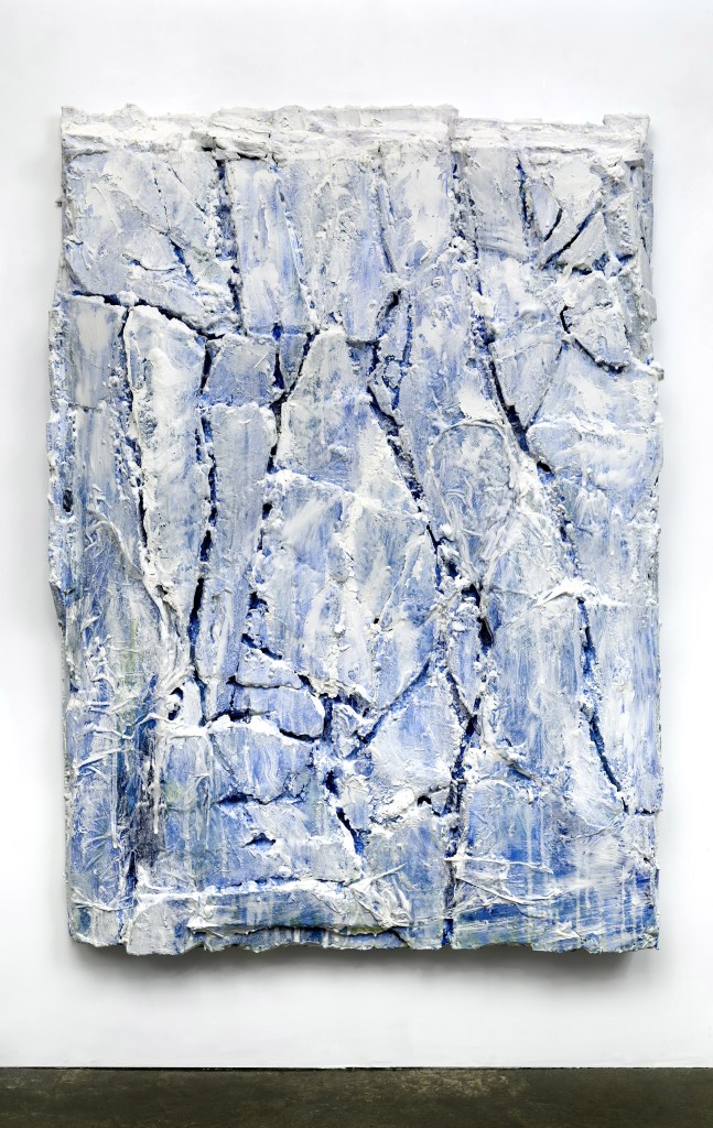 In De St. Croix’s relief painting the surface seems ice-like, cracking in chunks across the surface, the facade of glaciers breaking and fracturing.