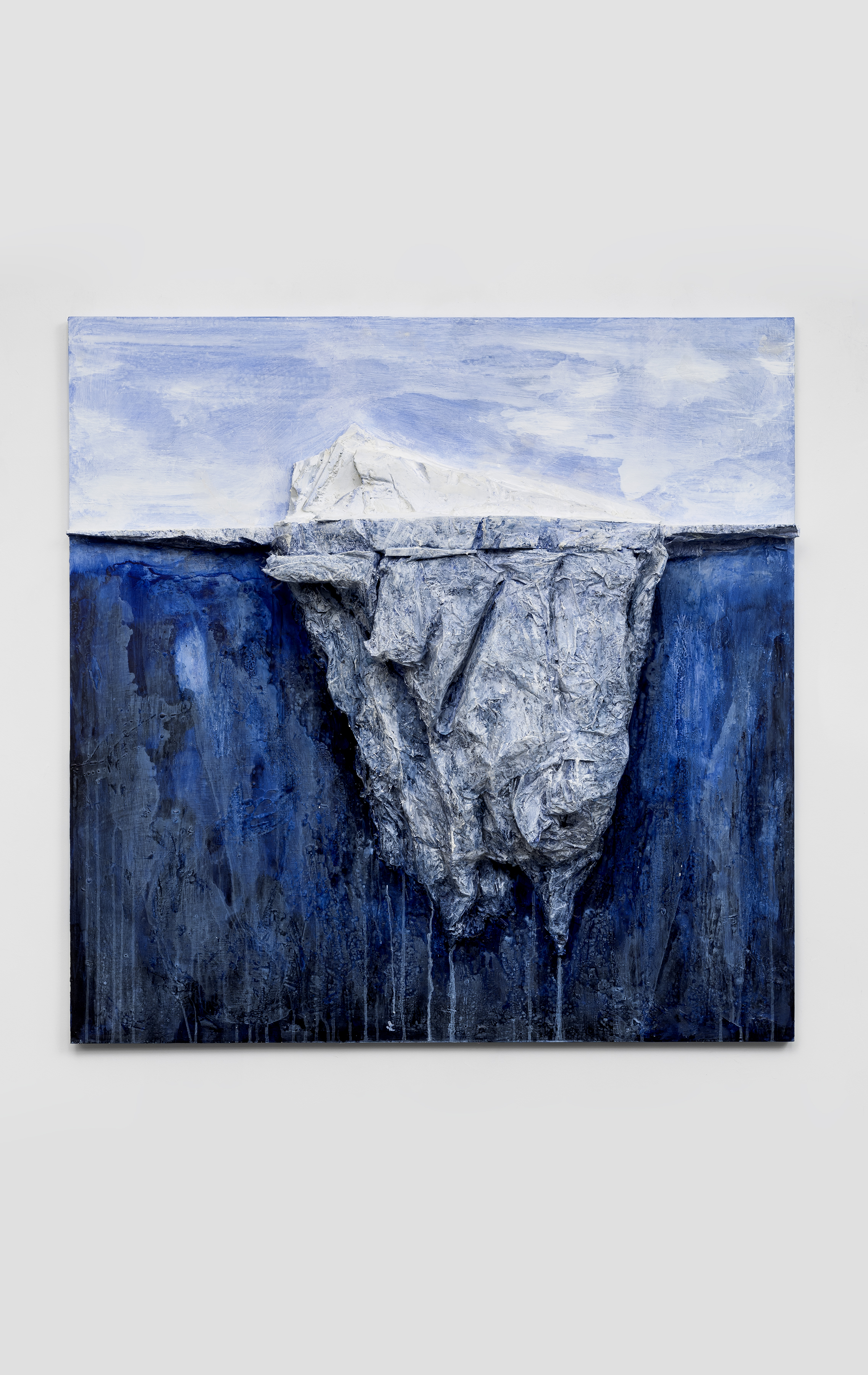 Dark/Light Arctic Ice Float depicts both the visible and underwater sides of a glacier; atop stark white berg while below the darker and larger is the portion usually hidden beneath the water. The underwater portion glows a blueish black in contrast to the stark white of the exposed berg.