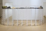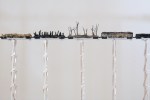 Moving Landscape II features a series of miniature landscapes on model railroad cars — depicting tundra, wetlands, forest, desert, etc. The train cars revolve in a circular loop through the entry wall of the exhibition and into the gallery behind it. These landscapes are in perpetual motion, akin to a snake chasing its own tail. With this gesture, De St. Croix reminds us that holding onto these ever-changing landscapes, despite our human desire, will always be just out of our grasp. Moving Landscape II is based on research from a 4,000 mile research trip throughout the western and select southern states in the High Arctic, Utqiaġvik and Svalbard. The research spanned landscapes from glaciers to deserts and high mountains to below sea level as well as a separate witness of the aftermath from the wildfires in Joshua Tree and national park forests throughout California.