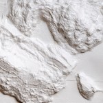 The paper works were produced from on-site aerial and on-the-ground photographs shot in the Arctic’s Svalbard Archipelago. The series of low-relief modular wall works are based on these research trips to the Arctic Circle. Landscapes based on images and memory were re-created with a light, malleable, and waterproof material – to use as an armature for sheets of cotton pulp in natural white to emulate snow.