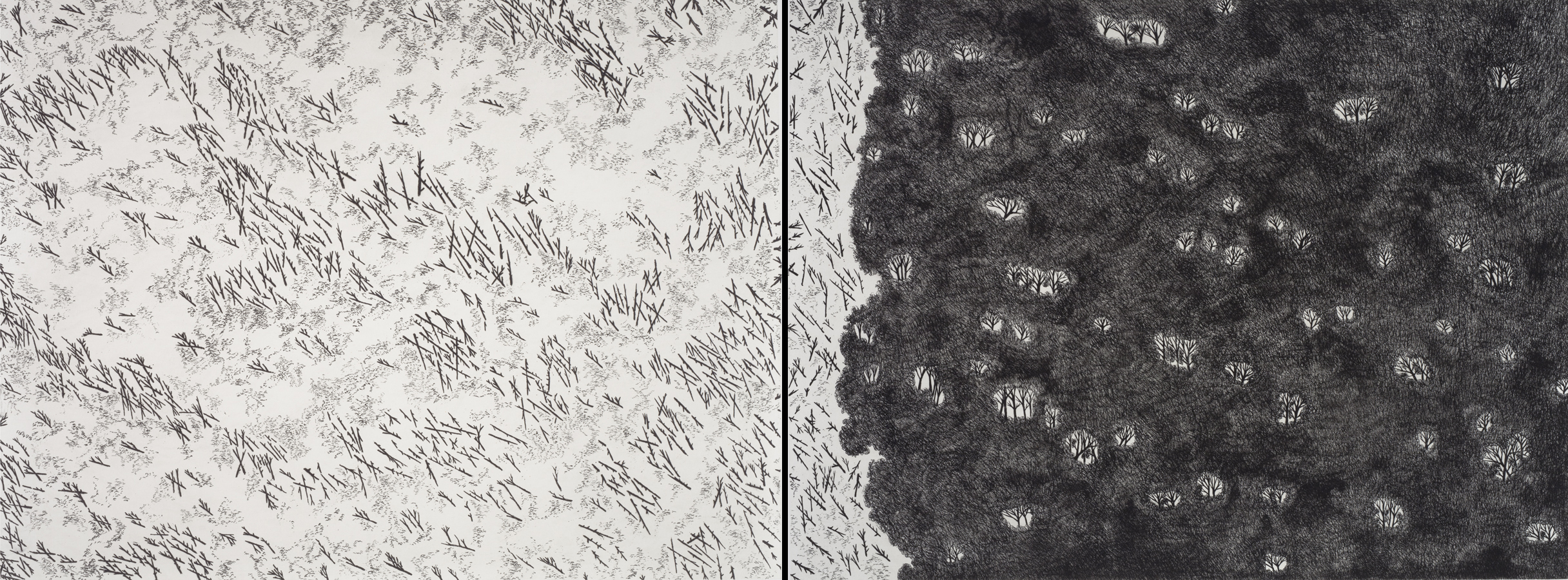 Tree Ruins (Haitian Charcoal Field) shows the remnants of the trees felled to make charcoal, while the diptych Tree Line (Haiti and Dominican Republic Border) uses physical division to emphasize the disparity between between the D.R.’s flourishing ecosystem and Haiti’s man-made wasteland. Though seductive at first glance, the landscapes are underlaid with turmoil and, upon closer examination, reveal the discord within themselves.