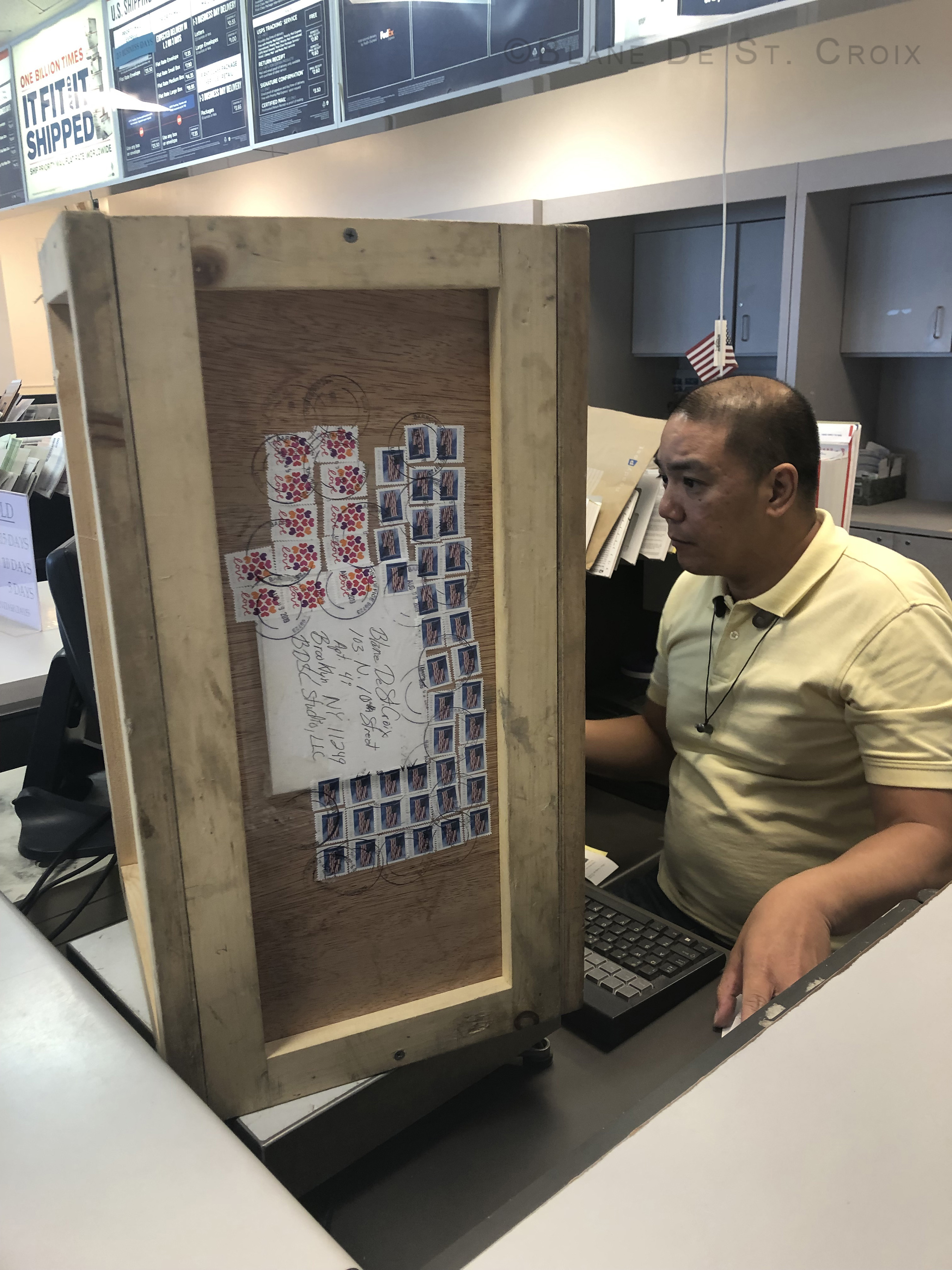 Artist mailing plein air crated sculpture at most northern USPS station, Utqiaġvik, AK.