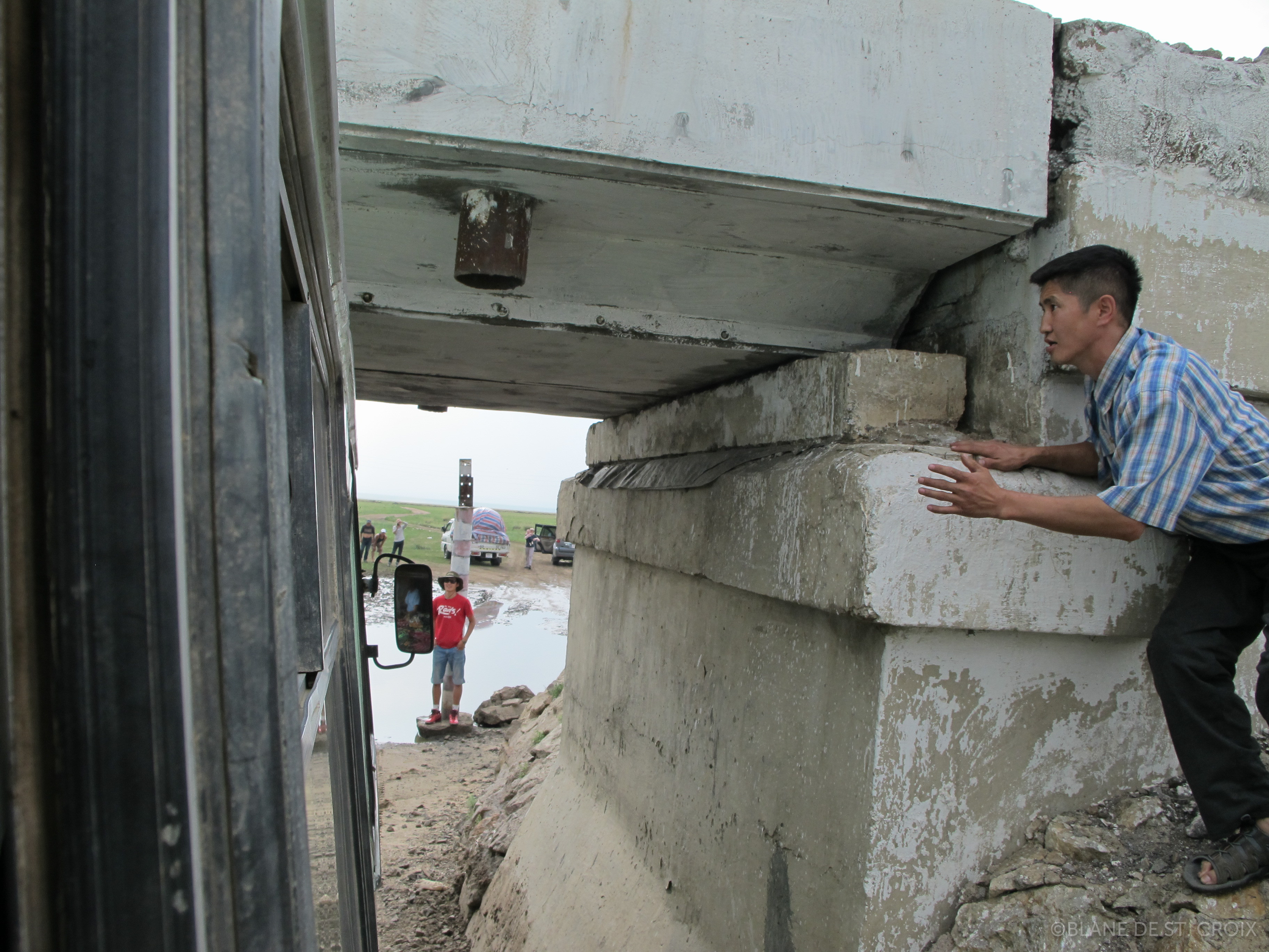 Caravan bus stuck under a low overpass. Surveying the damage.